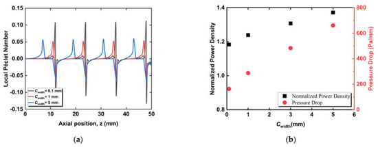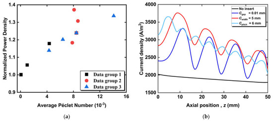 Here, ur is the local fuel velocity perpendicular to the anode surface at the anode-fuel channel interface, and A is the surface area of the interface between the fuel channel and porous anode. Figure 11a shows that, in general, an increase in the Péclet number leads to an increase in the SOFC power density. This is associated with the fact that radial flow facilitates fuel diffusion inside the porous anode, which then improves the electrochemical reactions and increases the power density. It should be noted from data group 2 that the normalized power densities are different for a similar average Péclet number. This proves that the distance fuel traveling inside the porous anode is another important factor for power density improvement, since a larger width of the cone base forces fuel to travel a longer distance in the anode. This is consistent with the observations in Figure 11b, which compares the current density distributions for the micro-tubular SOFCs with different cone-inserts. We demonstrate that the local current densities of the SOFC with inserts are systematically higher than that of the conventional micro-tubular SOFC, indicating that the electrochemical reactions are enhanced by the high local fuel concentration caused by radial flows. A smaller gap causes a higher current density peak, while a larger width also leads to a wider current density peak due to the long traveling distance of fuel in the anode. A decrease in the pitch leads to an increase in the number of peaks, which could effectively improve the output power density. However, it should be noted that increasing the local current density could also result in higher heat generations from electrochemical reactions. This may lead to local hotspots or high-temperature gradients, which might accelerate the degradation of the micro-tubular SOFC.