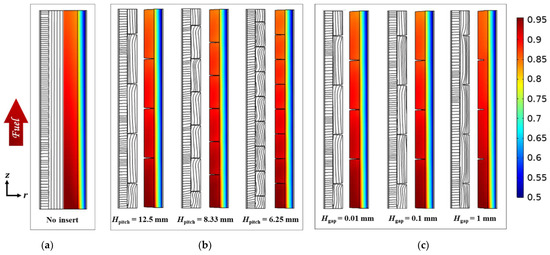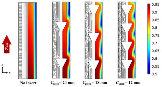 We next studied the effect of pitch variation “Cpitch” on flow and mass transfer characteristics in a micro-tubular SOFC. Figure 9 compares the streamlines and the CO mole fractions at the plane across the center axis for no insert and three cone-insert cases with a fixed gap of 0.01 mm and different pitches of 12 mm, 18 mm, and 24 mm. Figure 9 demonstrates that the wave interactions caused by the presence of the cone-insert become weaker as the pitch increases, so increasing the pitch causes a decrease in the radial concentration. The number of wavy patterns is inversely proportional to the insert pitch. A smaller insert pitch could enable fuel to enter the anode repeatedly.