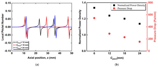 Figure 10a illustrates the axial Péclet number variations for the cases with pitches of 12 mm, 18 mm, and 24 mm, respectively. The Péclet number peaks have a relatively similar order of magnitude for all the cases. The location and the distance of the peaks vary depending entirely on the cone-insert location inside the fuel channel. The pitch case of 24 mm shows a slightly higher order of magnitude compared to 18 mm and 12 mm. This is mainly because the number of cones inserted directly affects the pressure and velocity profiles. As the pitch increases, the number of cones inserted decreases, which can be seen from the number of peaks.
