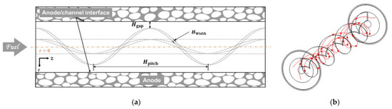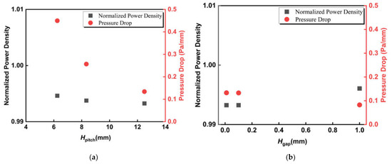 The effects of different gaps and pitches of helical screw inserts on the power density enhancement were investigated, as illustrated in Figure 12a. The gap, Hgap, is the distance between the helical screw insert and the anode-fuel channel interface. The pitch, Hpitch, is the distance measured between two points on the same plane of the helix tape that is one turn apart and parallel to the axis. The width, Hwidth, is the thickness of the helix tape, and it was fixed as 0.2 mm in our study.