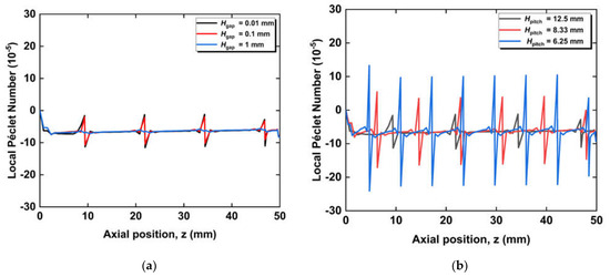 Figure 14 shows the local Péclet number as a function of axial locations at the interface between the fuel channel and porous anode for the micro-tubular SOFCs with different helical screw inserts. It should be noted that the Péclet numbers for all cases are on the order of 10−5, indicating a small radial velocity induced by the helical screw inserts. The non-zero velocity at the anode-channel interface is due in part to the flow rotation caused by helical screw inserts in the fuel channel. Figure 14a shows the Péclet numbers for the cases with three different gaps. A 1 mm gap has a negligible impact on the Péclet number distribution, while the gaps of 0.1 and 0.01 mm slightly increase the local Péclet number, which is mainly due to the increase in radial velocities with the decreasing gap. However, the maximum radial velocity induced by helical screw inserts is still three orders of magnitude smaller than that induced by cone-inserts. This is because the helical screw inserts generate and enhance the flow velocity in the circumferential direction, while the cone-inserts generate and enhance the flow velocity in the radial direction. Figure 14b shows that the oscillation amplitude of the Péclet number increases with the decreasing pitch of the helical screw insert. This is in part because the smaller pitch leads to a stronger flow interaction between two subsequent helical ridges. It should be noted that the location of the Péclet number peaks depends entirely on the helical ridge locations.