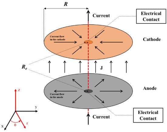 where r is the radial coordinate; Vc and Va are the cathode and anode voltages (V), respectively; rc and ra are the cathode and anode resistances (Ω), respectively; J represents the current density (current per unit area (A·m−2)) flowing from the anode to the cathode through the separator; Re and R stand for the radii of the electrical contact and the LIB coin cell, respectively.