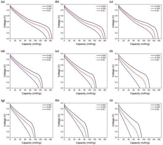 In the discharge experiments to test the combined effects of cyclable lithium loss and electrolyte depletion, currents corresponding to 0.05 C, 0.25 C, and 0.5 C were discharged at 25 °C, and the discharge was terminated when the cell voltage reached 3 V. In Figure 2a–i, the experimental results of the galvanostatic discharge of the LIB cell for nine different degradation levels are presented and show the effect of cyclable lithium loss and electrolyte depletion on the discharge voltage at various current levels.