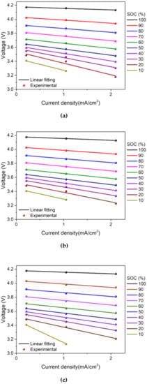 From the test data of cells 1, 2, and 3, the relationship between the discharge-current density and the voltage are shown in Figure 3a–c, respectively. Graphs corresponding to cells 4–9 were excluded to avoid redundancy. During discharge, the current density and cell voltage can be well-expressed as linear functions in most SOC regions, and the discharge voltage can be effectively expressed at various degradation levels using Equation (7). A linear dependence of the cell voltage on the applied-current density was confirmed for cells 4–9 (not shown here).