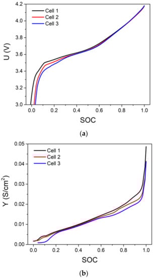 where Y is a fitting parameter, and its physical meaning is analogous to the rate constant of an electrochemical reaction; U is a fitting parameter, and its physical meaning is the equilibrium voltage of the battery cell []. We represent Y and U as a function of SOC following the approach of Gu []. The details of the process of deriving Y and U as a function of SOC is described in the Section 4.