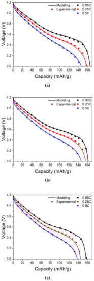 To evaluate the feasibility of the modeling approach, the cell voltage of the LIB cell calculated from the method described above were compared with the experimental measurements acquired with various discharge rates for different levels of LIB cell degradation. Using U and Y of nine different degradation levels due to the combined effects of cyclable lithium loss and electrolyte depletion as model parameters, the calculated discharge curves when discharging from 0.05 C to 0.5 C of LIB were compared with the experimental results. In Figure 5a–c, the discharge experimental results of the LIB cell with no cyclable lithium loss and three different electrolyte depletions show good agreement with the modeling results. The slight deviation between the modeling results and experimental data near the end of discharge may come from the fact that the current density and voltage did not follow a linear relationship owing to a sudden voltage drop in the range of an SOC less than 10%. The validity of the modeling approach for predicting the effect of cyclable lithium loss and electrolyte depletion on the discharge behavior of cells 4–9 was also confirmed although they were excluded to avoid redundancy.