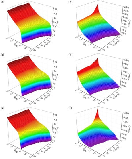 Based on the verified models for nine different levels of cyclable lithium loss and electrolyte depletion, the degradation behavior of the LIB cells was predicted over a broader range. Correlation of U and Y on SOC and cyclable lithium loss were calculated to predict the voltage change as the LIB cell deteriorated over a broader range that extends beyond the nine degradation levels presented in Table 1. For this study, we used the publicly available kriging software, which is widely used in geostatistics []. Based on regression, the kriging method generates the unknown values of the functions, which have multiple parameters through an appropriate interpolation and extrapolation from the measured data. The U and Y values with respect to SOC for nine different levels of cyclable lithium loss and electrolyte depletion in Table 1 were entered into kriging software as input data to obtain U and Y values in a broader range of cyclable lithium loss. Figure 6a–f presents these outcomes as 3D graphs of U and Y with respect to the SOC and cyclable lithium loss.