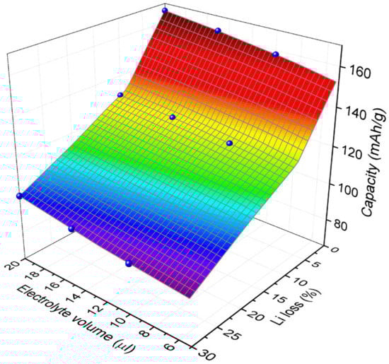 The discharge capacity of the LIB cell was estimated by using U and Y calculated for cyclable lithium losses ranging from 0 to 30% and an electrolyte volume ranging from 5 to 20 μL. The capacity at the discharge rate of 0.05 C was calculated by using the above-mentioned model and the parameters of U and Y, and it was compared with the experimental results in Figure 7. The 0.05 C discharge capacity is 166 mAh/g with no cyclable lithium loss and no electrolyte depletion. When there is no cyclable lithium loss, the 50% of electrolyte depletion brings about 5% reduction. On the other hand, the cyclable lithium loss of 30% coupled with 50% of electrolyte depletion results in 46% reduction. As the amount of cyclable lithium loss and electrolyte depletion increases, the decrease in capacity becomes more pronounced.