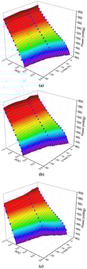 Power fade is one of the most important factors that contribute to the degradation of LIB cell performance as a result of various degradation mechanisms. In particular, when a LIB cell with a high degree of degradation is discharged with a high current, the available discharge power is significantly lowered. Figure 8a–c shows the results of calculating the discharge power with respect to SOC and cyclable lithium loss for electrolyte volumes of 20, 15, and 10 μL at a discharge rate of 0.5 C. Because the voltage drops as the SOC reduces during discharge, the discharge power drops as the SOC reduces for a given electrolyte volume. Figure 8a illustrate the influence of the cyclable lithium loss on the discharge power because the use of an electrolyte volume higher than 20 μL did not produce any noticeable change in the electrical performance of the LIB coin cell as mentioned in Section 3. The 0.5 C discharge power at the SOC level of 0.8 is 541 mW/g, with no cyclable lithium loss and no electrolyte depletion. When there is no cyclable lithium loss, the 50% of electrolyte depletion brings about 1% reduction in discharge power during 0.5 C discharge at the SOC level of 0.8. Figure 8b,c shows that the impact of the cyclable lithium loss on the discharge power becomes much stronger than that at 20 μL, as the electrolyte volume drops up to 10 μL. When the cyclable lithium loss is 30%, the 50% of electrolyte depletion results in 13% reduction in discharge power during 0.5 C discharge at the SOC level of 0.8.