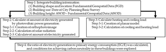 In this study, the solar radiation and electricity generation available at each of the buildings targeted were calculated on the basis of the orthophoto images created. In addition, a calculation model was created with the building information in the GIS to calculate the primary energy consumption of the HVAC system for each building. Finally, the primary energy consumption and electricity generation were compared to verify the conditions for a building to have virtually zero carbon emissions.