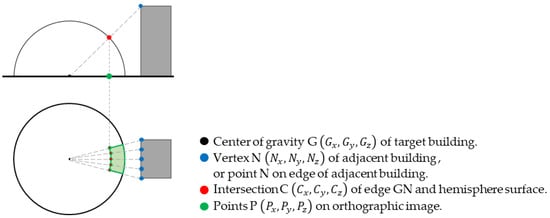 Buildings were selected from the GIS to create a positive projection image. These buildings are referred to as target buildings. In addition, from the GIS, buildings within a radius of 200 m around the center of gravity G of the target buildings were selected. The selected buildings are referred to as adjacent buildings. A hemisphere centered on the center of gravity G of a target building was assumed. Figure 3 shows the method of projecting the adjacent buildings onto an orthographic image. The bottom of the hemisphere is assumed to be an orthographic image. The black points in Figure 3 are assumed to be the center of gravity G of the target building. The blue points are the vertices N of the adjacent buildings or the points N on the edges. The red points are the points C on the hemispherical surface. Point C is the intersection of an edge GN and a hemisphere surface. It was calculated using the following Equation (3).