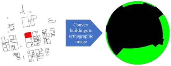 All points N of the adjacent buildings were projected onto the orthographic image by repeating Equations (3)–(5). The buildings were projected by filling in polygons composed of multiple points P projected onto the orthographic image. All adjacent buildings were projected in the same way. The orthographic image created is shown in Figure 4. The red building on the left is the target building, and the rest of the buildings are adjacent buildings. The right figure shows the result of converting the adjacent buildings around the target building into an orthographic image. SVF is the ratio of the sky area () within the circle to the area of the circle (). The SVF was calculated from the orthographic image using the following Equation (6).