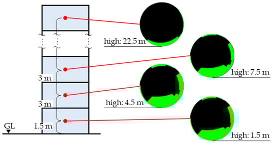 The influence of adjacent buildings varies depending on the height at which the orthographic image is created. Therefore, multiple orthographic images were created for a single building at different heights of the center of gravity. Figure 5 shows different height settings for the center of gravity and the orthographic images for each height. The lowest height was set at 1.5 m from the ground surface. From there, orthographic images were created for every 3 m in accordance with the height of the building. The images created for each height showed different shapes of adjacent buildings, indicating the need to create images for each height.