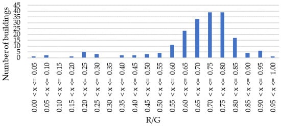 Figure 9 shows a histogram of the annual electricity generation. Many buildings had electricity generation ranging from 0 kWh/(m2·year) to 40 kWh/(m2·year). Some buildings generated 170 kWh/(m2·year) to 180 kWh/(m2·year), depending on the location.