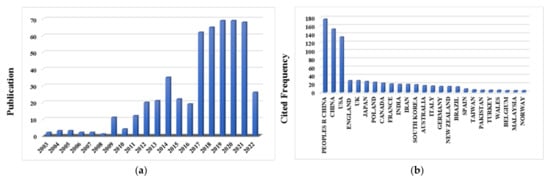 Search results by Web of Science. (a) Distribution by time; (b) Distribution by country.