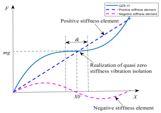 The development of QZS, which is realized by the parallel combination of positive and negative stiffness elements, can be traced back to the 1980s. When a force () is applied to a system, the corresponding deformation is denoted as . Then, if is positive, we always call it ‘positive stiffness’. Otherwise ‘negative stiffness’. The drawback of negative stiffness elastic elements is their instability, so they are rarely used alone in engineering applications. However, it is not the case when positive and negative stiffness elements are connected in parallel. The basic principle of QZS is shown in Figure 2 and the total stiffness of the system can be expressed as . In practice, the positive stiffness can be adjusted so that and . In this case, the total stiffness of the system is infinitely close to zero, so it is called as ‘QZS’.