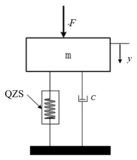A simplified schematic diagram of QZS-based vibration isolation is shown in Figure 3. When the mass m is excited by the external force F, the system will generate forced responses, leading to vibration. During the vibration, the positive stiffness element in the QZS plays the key role of loading and damping. The negative stiffness element can adjust the system stiffness according to different working conditions. When the mass is at static equilibrium position, the dynamic stiffness of the system is zero. At the same time, the vibration isolation device has the advantages of low natural frequency and large bandwidth. According to the literature, the current research on QZS-based vibration isolation mainly focuses on two aspects: one is static analysis and the other is stability analysis.