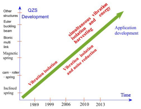 According to the vibration isolation principle, linear vibration isolation devices can only play a role when the excitation frequency is larger than times natural frequency of the system. Therefore, the performance of linear vibration isolators is not good under low-frequency or ultra-low frequency vibrations. In order to deal with this problem, it is often necessary to reduce the stiffness of the system. However, reducing the stiffness will reduce the system stability and the loading capacity. To resolve this conflict, nonlinearity is introduced into linear vibration isolators. QZS is just one kind of new nonlinearity, which attracts more and more attention nowadays in the field of vibration isolation due to near-zero dynamic stiffness and strong loading capacity.