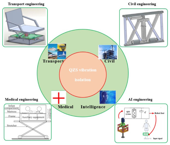 So far, QZS vibration isolators have been widely used in different fields, as shown in Figure 5, such as transportation engineering, marine engineering, aerospace, civil engineering, and so on. As for new energy vehicles, ride comfort, road handling, and battery endurance are main challenges in future. To address these problems, Thanh et al. [56] designed a QZS vibration isolator for a car seat, as shown in Figure 5. Zhou et al. [57] presented a QZS vibration isolator for medical infant cabins. Hu et al. [58] proposed a QZS vibration isolator consisting of three linear springs for pipeline vibration suppression in the field of civil engineering. As for transportation engineering, bridges are threatened by low-frequency vibrations. Attary et al. [59,60,61] designed a QZS vibration isolation device to reduce the low-frequency vibration of bridges and the simulation results validated its excellent vibration isolation performance. Ishida et al. [62] proposed an origami-type QZS vibration isolator for earthquakes and conducted experimental validations in a simulated seismic zone. In order to protect industrial equipment (e.g., generators, compressors and pipes) from vibration hazards in engineering applications, Burian et al. [63] applied QZS properties to design proper supporting bases for engineering equipment, which could effectively reduce vibration transmission.