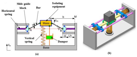 Carrella et al. [50] built a nonlinear vibration isolation system consisting of a vertical spring and two oblique springs connected in parallel. The two inclined springs were used to generate negative stiffness [64,65,66]. The behaviors of vibration transmission and isolation were studied and the QZS vibration isolation characteristic with high static and low dynamic stiffness was found. At the same time, it was proven that there was a special relationship between the geometry and the QZS stiffness, which provided a theoretical foundation for follow-up research. Later, Xu et al. [67] further increased the number of inclined springs and built a structure consisting of four inclined springs and one vertical spring. Similar to the inclined spring structure, many researchers also studied other related structures. Thanh et al. [56] proposed a novel QZS vibration isolation device shown in Figure 6a, which is composed of two parts. The positive stiffness was provided by the vertical spring and the negative stiffness was generated by two symmetrical structures. Liu et al. [68] proposed a QZS vibration isolator based on the ‘spring-rod’ structure, as shown in Figure 6b. The isolator was composed of a vertical spring and two identical pre-compressed horizontal springs, where the combination of horizontal spring, slider, and rod generated negative stiffness and the vertical spring generated positive stiffness. The advantages of this kind of isolator include high stability and loading capacity. Finally, a simplified mathematical model of the QZS vibration isolation was established and analyzed.