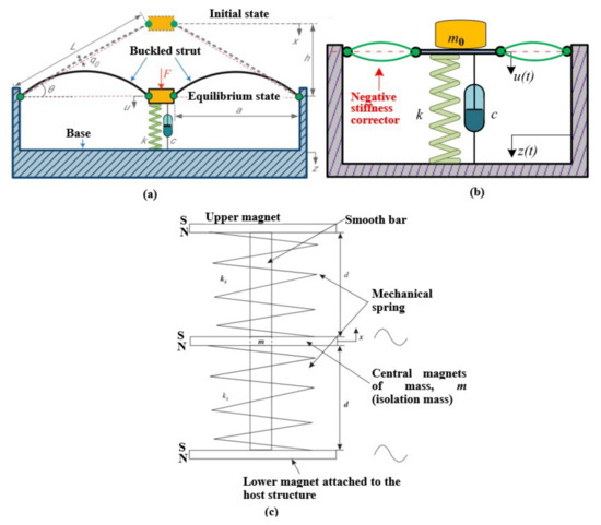Zou et al. [79] proposed a QZS vibration isolator by using a shear structure, as shown in Figure 9c. Then, negative stiffness was provided with by two scissor-like structures and springs. Each scissor-like structure included a coil spring and a linear damper. The geometrically nonlinear stiffness was calculated by parametric analysis and the isolator could be designed to obtain a large frequency band.