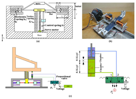 Sun et al. [73] proposed a QZS vibration isolator with simple linear and time-delay active control strategy. As shown in Figure 8a, the structure is connected by two pairs of springs and a rod with length a in the horizontal direction. Each pair of springs is composed of linear stiffness k1 and nonlinear stiffness k2. In the vertical direction, the mass is connected to the base by a spring with a stiffness of k0 and an active control unit. The control unit is composed of a vertical spring and a servo motor, where the motor generates active feedback force. Zhou et al. [74] presented a QZS device with active control, where the positive stiffness was provided by mechanical springs and the negative stiffness was provided by electromagnetic springs. As shown in Figure 8b, the beam acted as a spring and the negative stiffness was determined by the current through the electromagnet. Xu et al. [75] proposed a novel QZS actuator with active control. The actuator was composed of a negative stiffness electromagnetic spring and a positive stiffness flexible link. Thanh et al. [76] proposed a negative stiffness vibration isolator with active control for low-frequency seat vibrations. The isolator introduced an adaptive intelligent controller to obtain high performance of vibration isolation. As shown in Figure 8c, the whole model consisted of a negative stiffness structure, vertical springs, dampers, and a low-friction cylinder controlled by a proportional valve.