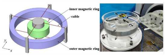 In many cases, the vibrations are multi-direction, instead of single-direction. Therefore, it is necessary to design multi-direction QZS vibration isolation devices. Liu et al. [80] proposed an in-plane QZS vibration isolation device, as shown in Figure 10. The device consisted of two concentric magnetic rings and eight cables connected inside the magnetic ring. Interactions between two magnetic rings generated negative stiffness and the cables generated positive stiffness. Vibration in the horizontal direction could be arbitrarily decomposed into orthogonal vibrations, so that vibrations in any direction could be reduced effectively.