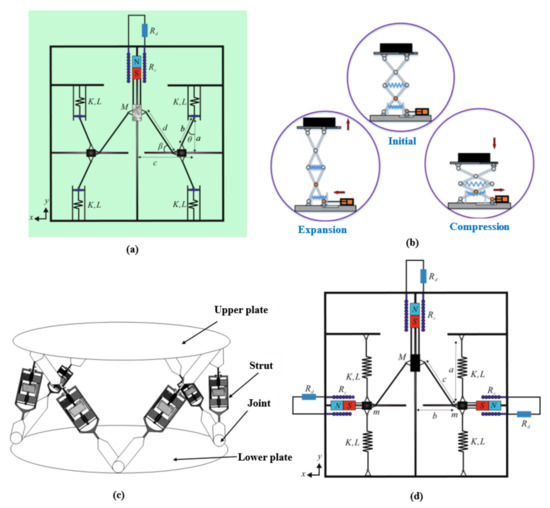 Electromagnetic vibration energy harvesting was based on the Faraday’s law of electromagnetic induction. In recent years, QZS-based electromagnetic SVIEH devices have attracted more and more attention. Yang et al. [83] first proposed a high-order quasi-zero stiffness (HQZS)-based SVIEH structure. As shown in Figure 12a, by adjusting structural parameters, the HQZS can achieve arbitrarily small stiffness at the equilibrium position. Compared with the QZS four-stable system, the HQZS structure had more advantages in vibration isolation and energy harvesting. Li et al. [84] proposed a novel QZS-based bistable electromagnetic energy harvesting device for ocean wave energy. As shown in Figure 12b, the structure consisted of two biomimetic X structures and a power take-off (PTO) system. The new biomimetic X-structure had QZS and bistable properties. There was a mechanical rectifier and electromagnetic DC generator in the PTO system. Compared with linear energy harvesting devices, its energy harvesting efficiency was significantly enhanced [85]. Lu et al. [86] proposed a QZS electromagnetic Stewart platform to achieve SVIEH. As shown in Figure 12c, for various mechanical and electrical parameters, the analytical and numerical results both demonstrate that the frequency band of vibration isolation extended to lower frequencies and produces considerable power output. Moreover, the increase in energy harvesting led to reduced vibration transmissibility under varying some parameters. Yang et al. [87] proposed a multistable and multidirectional (MMD) QZS energy harvesting system based on the former. As shown in Figure 12d, the structure was guided by the slider to realize the relative movement between the permanent magnet and the coil. At the same time, the multi-stable behavior was analyzed. It was verified by experiments that the MMD QZS energy harvesting device can easily realize low-frequency energy harvesting.