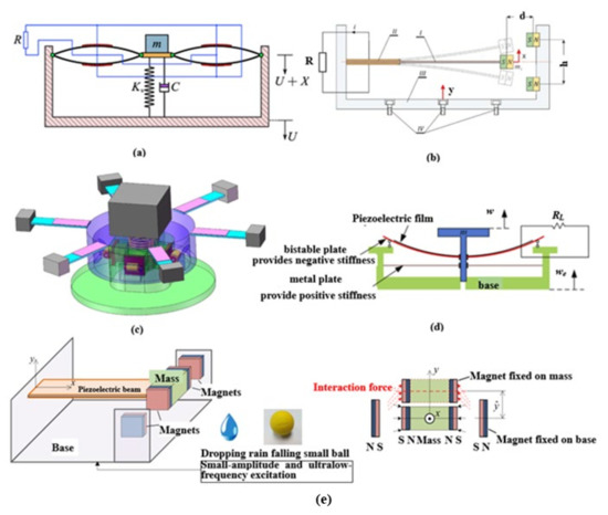 Many scholars have combined the advantages of QZS with piezoelectric materials for vibration energy harvesting. Liu et al. [88] proposed piezoelectric beams with QZS for simultaneous low-frequency vibration isolation and energy harvesting. As shown in Figure 13a, the electrical energy output by the deformed piezoelectric material was very high. At the same time, the piezoelectric buckling beam also exhibited negative stiffness. Therefore, the structure had a good vibration isolation effect in the low frequency environment. Compared with traditional linear vibration isolators and cantilever beam piezoelectric devices, it achieved better vibration isolation and energy harvesting in lower frequency environments. Liu et al. [89] further proposed a novel QZS vibration isolation and piezoelectric energy harvesting device for vibration localization in previous research. As shown in Figure 13c, the device consisted of a QZS device and six piezoelectric cantilevers. The device can not only achieve a good low-frequency vibration isolation effect, but also achieve piezoelectric energy harvesting in multiple directions. Sun et al. [90] proposed and analyzed a nonlinear, adjustable, and continuous structure. As shown in Figure 13e, the structure can have large amplitude vibration with adjustable output frequency. Iwaniec et al. [91] designed a QZS dual potential energy well and piezoelectric structure energy harvesting device. As shown in Figure 13b, the QZS effect resonator was able to generate larger amplitude and higher voltage output. The advantage of this device was the wider distribution of potential wells and lower potential barriers. Lu et al. [92] proposed a QZS device of a bistable piezoelectric composite plate structure for SVIEH in a low-frequency environment. As shown in Figure 13d, a feasible analytical model was established through theoretical analysis. The approximate solution of displacement transmissibility and voltage amplitude was obtained. Finally, the accuracy of the approximate solution was judged by numerical simulation. The result show that the energy harvesting increases with the decrease of displacement transfer rate in a certain frequency band range.