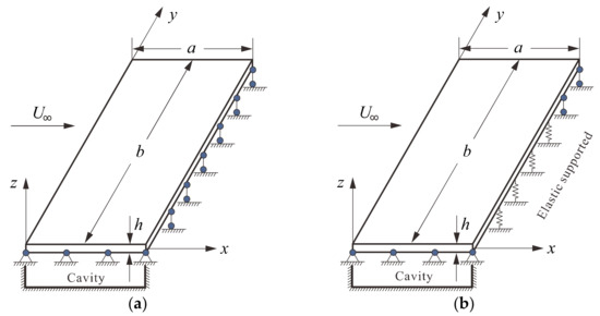 Considering a three-dimensional thin-walled panel with equal thickness shown in Figure 1, the lengths along the airflow direction and the spanwise direction are a and b , respectively. The thickness h is relatively small to meet the Kirchhoff assumption. The outer surface of the panel is exposed to supersonic airflow with a velocity of U . The inner surface is at the atmospheric pressure of still air. So, only the aerodynamic force on the outer surface needs to be considered in the flutter calculation. In Figure 1a, the four boundaries of the thin-walled panel are constrained by simple supports. In Figure 1b, it is considered that the local or all boundaries of the panel are supported by springs with finite stiffness coefficients. Only elastic supports perpendicular to the panel surface are considered here owing to the deformation of the panel being mainly perpendicular to the panel surface under the action of aerodynamic load. Constraints in the horizontal direction still retain the same conditions as the panel with simply supported boundaries on four sides.