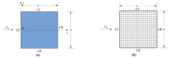 A square panel in a wing structure shown in Figure 2a is connected to ribs and stringers by rivets when flying at a supersonic speed. The side length is a = b = 300 mm and the thickness is h = 1.2 mm. For convenience, the boundary lines of the windward side, the leeward side, the tip side and the root side are denoted as LF , LB , LT and LR , respectively. The panel is divided into 20 plate elements both along the chord direction and the span direction. The total number of elements is 400, and the total number of nodes is 441, as shown in Figure 2b. The physical parameters of the panel are shown in Table 1 [19]. In the preliminary flutter calculation process, it is considered that the panel is at a simply supported state on four sides. The positive direction of the x-axis is the direction of the airflow. When the aircraft is flying near sea level, the air density is taken as ρ = 1.226 kg/m3 and the air density ratio is taken as ρ r = 1.0 .