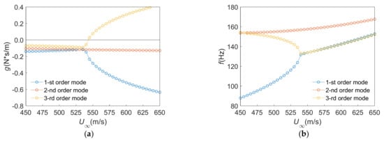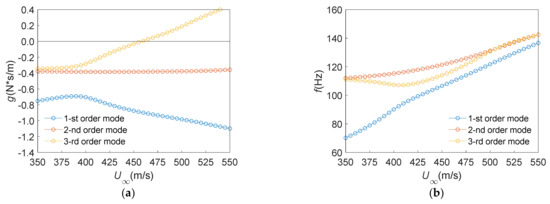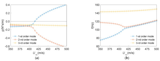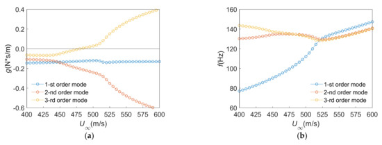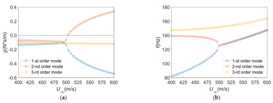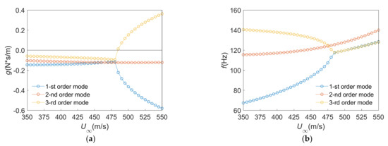 Flutter velocity and flutter frequency of the panel are calculated for the three cases based on the algorithm proposed in this paper when the stiffness coefficient of the supported spring is 2000 N/m, as shown in Figure 4, Figure 5 and Figure 6. It can be seen from Figure 4 that when the leeward boundary line of the panel is under an elastically supported state, the flutter mode jumps from the third order to the second order compared with the simply supported state on four sides. The flutter velocity decreases from 539.4 m/s to 504.1 m/s, and the flutter frequency decreases from 132.4 Hz to 126.2 Hz. The decrease rates are 6.54% and 4.68%, respectively. It can be seen from Figure 5 that flutter occurs in the third mode when the side edge of the panel along the airflow is under an elastically supported state. The flutter velocity is 480.4 m/s, and the flutter frequency is 134.9 Hz. When flutter occurs, the first-order mode is coupled with the second- and third-order modes. It can be seen from Figure 6 that when the windward edge is under an elastically supported state, the flutter velocity further drops to 430.7 m/s, and the flutter frequency drops to 103.6 Hz. At this time, the flutter occurs in the first-order mode. Overall, the flutter mode of the panel jumps accordingly due to the different positions of the elastically supported edge. The flutter velocity and flutter frequency are the highest when the elastically supported boundaries are located on the leeward boundary line, followed by the tip or root side boundary line and the windward side boundary line.