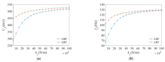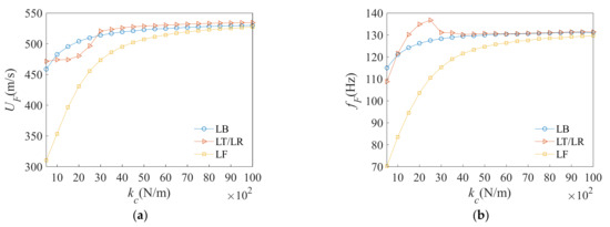 Figure 10. Flutter speeds and frequencies versus the stiffness of elastic supports: (a) U F versus k c ; (b) f F versus k c .