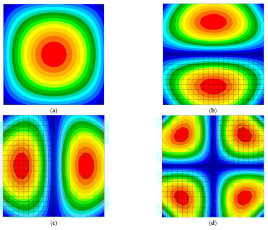 Figure 11. The first four modes of the panel with elastically supported boundaries on four sides: (a) the first mode (53.28 Hz); (b) the second mode (115.27 Hz); (c) the third mode (115.27 Hz); (d) the fourth mode (167.23 Hz).