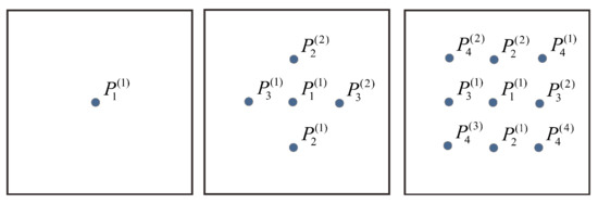 Flutter calculations are usually performed in the modal space to reduce computational complexity. It is assumed that the first r-order natural modes of the structure are retained and the j-th order is denoted as φ j , ( j = 1 , 2 , , r ) . Since the three-dimensional panel considered is mainly deformed in the z-axis direction, the displacement value set w j perpendicular to the panel of the modal function φ j can be reconstructed into a two-dimensional matrix according to the x-axis and y-axis coordinates of the nodes. After that, the k-th order modal function of the panel is obtained by interpolation operation, which is denoted as f j ( x , y ) . Similarly, the angular displacement value sets θ x j and θ y j of the panel can also be reorganized according to the x-axis and y-axis coordinates of the nodes. The slope value functions of the displacement with respect to the x-axis and y-axis directions can be obtained by interpolation and are denoted here as f j ( x ) ( x , y ) and f j ( y ) ( x , y ) , respectively. In the interpolation process, it is necessary to ensure that the obtained interpolation functions have sufficient accuracy. So, a high-precision interpolation algorithm is required in addition to a finite element mesh up to a certain density. In the paper, the infinite plate spline (IPS) interpolation method is used to calculate the spline matrices. The structural finite element node displacement is transformed into the interpolation point displacement. The interpolation efficiency is high with good precision. Even for high-order mode shapes, high-precision interpolation results still can be obtained. After the interpolation function expression is determined, the displacement function of the panel can be expressed as