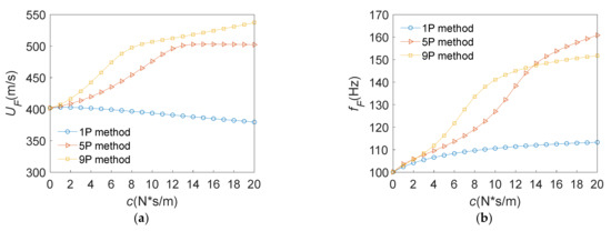 Figure 15. Effects of the three damping schemes on flutter characteristics: (a) U F g ; (b) f F c .