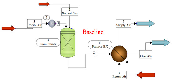 Figure 1 depicts a conventional space heating furnace fueled by natural gas. A primary burner (unit ID 4) assumed to be operating at an AFT of 1300–1400 °C supplies the energy for elevating the return air temperature (stream ID 6) by ~25 °C at a nominal capacity of 40,000 Btu/h (~800 CFM of air flow rate) via a primary heat exchanger (unit operation 6).