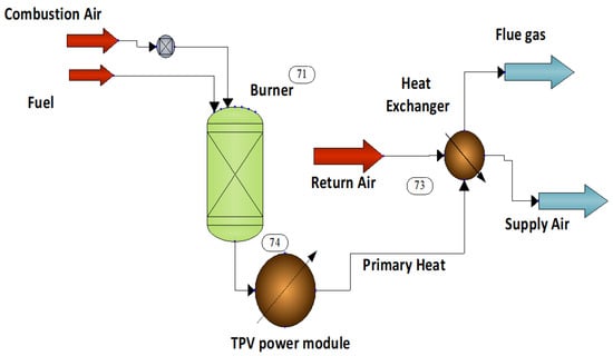 The main method involved thermodynamic modeling of the integrated energy system using the CHEMCAD® (NXT 1.0.2, Chemstations, Houston, TX, USA) process simulation software package to evaluate the thermal and electrical output for supporting building’s thermal needs [17]. The Soave–Redlich–Kwong equation of state was used for the global K-value and enthalpy models utilized in the presented configurations. The main energy sources considered were natural gas (baseline), electric grid, and hydrogen. A detailed performance analysis of the TPV-based self-powered furnace system was conducted. Different models were developed to help analyze an integrated system consisting of a TPV power generator module, along with an emitter, heat exchangers, and combustion reactors. The main objective was to evaluate the integrated system from thermal and material balancing standpoints while achieving optimal efficiency and assessing the carbon dioxide footprint of a given configuration. The key requirement of generating electrical power in the desired range while utilizing all heat streams of varying temperatures was analyzed at different TPV efficiencies. The primary criterion was to develop a simulation model to analyze the maximum achievable energy efficiency while producing up to 400 W of onsite electric power to power electrical balance-of-plant (BOP) load requirements such as air handler, combustion air blower, control board, ignitor, sensing, etc. It must be noted that the model did not consider any physical or material constraints with regard to complete system integration—particularly that of utilizing all heat streams and their temperatures.