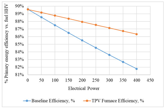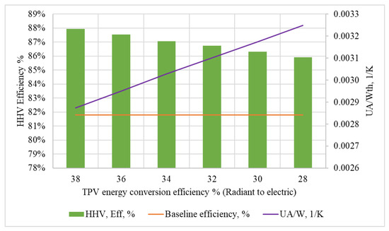 Figure 5 presents the primary energy efficiency of the self-powered furnace system generating 400 W of parasitic power in supporting the balance of plant. Also shown is the effective UA of the heat exchanger for each Watt of thermal energy supplied. The electrical efficiency of the TPV cell varied from 28% to 38% while adjusting the amount of primary energy supplied to the TPV burner (unit ID 135 in Figure 4). As shown, the primary energy efficiency rises from 85.9% to 88% as the TPV efficiency increases from 28% to 38%, whereas the radiant, spectral, and view factor efficiencies were assumed to be 75%, 60%, and 80%, respectively [18,25]. Further, the required UA of the heat exchanger decreases as the power generation efficiency increases.