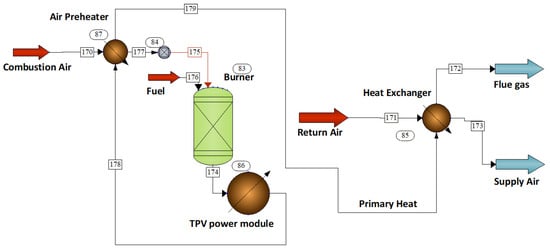 A preliminary energy balance study of the furnace configuration with and without the TPV power module was initially conducted to assess the energy-saving potential of each design configuration along with the heat recovery approach selected. Figure 2 shows the modified baseline model (Figure 1) with an emitter–TPV power module (unit ID 74) added in between the burner (unit ID 71) and the primary heat exchanger (unit ID 73). Table 2 elaborates on the role of the individual major unit operations along with key specifications and the calculated thermal property values for individual streams.