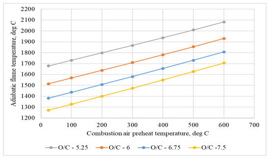 Effect of combustion air temperature and oxygen-to-carbon ratio on adiabatic flame temperature.