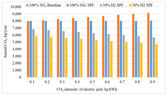 The analysis presented so far assumes natural gas as the primary fuel; however, hydrogen is being considered as a renewable fuel to help offset the carbon dioxide emissions associated with building equipment [28]. Therefore, the impact of blending green hydrogen (with zero carbon intensity) on the carbon reduction potential of the self-powered configuration was investigated. The model presented in Figure 4 was further analyzed with 30% and 50% renewable hydrogen blend concentration (molar percentage) in natural gas supply. The primary fuel flow rate’s energy content (higher heating value of the combined blend) was adjusted to meet the thermal rating of the furnace after generating the 0.4 kW onsite power (BOP), for a daily thermal load demand of 120 kWh. The effective carbon dioxide intensity for the 30% and 50% molar hydrogen blend in natural gas fuel was assumed to be 0.156 kg/kWh and 0.135 kg/kWh, respectively, calculated by the model presented in Figure 4.