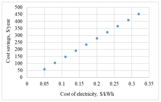 Similarly, the economic benefit of utilizing a TPV-powered furnace consuming 4 kWh of electrical energy per day was also analyzed at different costs of electricity. Figure 10 displays the annual utility bill savings of the TPV furnace operated in regions with electric costs ranging from USD 0.05 to 0.33 per kWh, which is representative of US regional tariffs [23]. The annual operational energy savings of up to USD 450 can be realized as a result of lower fuel consumption and avoiding electrical grid purchases.