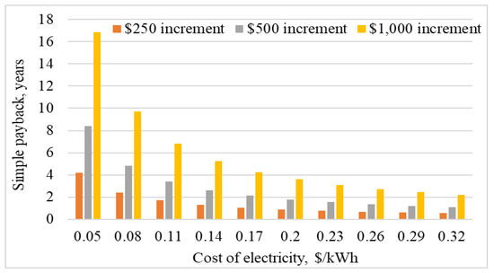 The addition of a power module to the conventional furnace will impose higher capital costs. Hence, it is important to understand the influence of these higher capital costs (difference in cost between self-powered and conventional furnace configurations, termed as incremental cost) on the payback period. The analysis was extended to calculate the simple payback period for three different incremental costs of USD 250, USD 500, and USD 1000. The payback period was calculated by dividing the incremental cost by annual energy cost savings at different costs of electricity. Figure 11 displays the simple payback period for regions with different costs of electricity at three different incremental costs. As shown, regions with relatively higher costs of electricity benefit the most where the payback can occur in less than three years. In considering the deployability of these advanced systems, one must consider the energy and economic value proposition in addition to the ancillary advantage of resiliency.