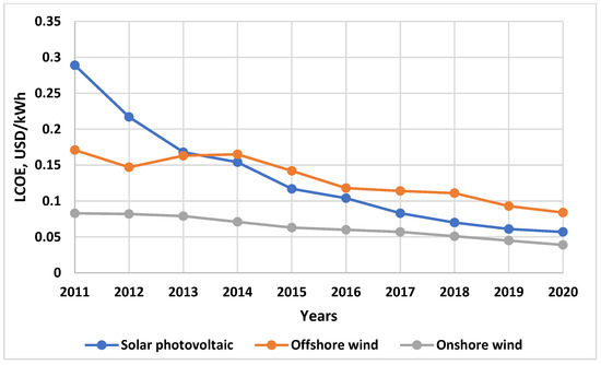 Renewable energy (RE) significantly contributes to the transition to the sustainable development of the world economy. Traditional energy resources are harmful to the environment, affect climate change, and impair human health. Oil, natural gas, and other fossil fuels have long been considered acceptable for use due to economic reasons and the lack of alternatives [1]. Technological advances in Industry 3.0 have led to the development of RE equipment. However, in the second half of the XX century, the cost of RE production was high. In recent decades, it has decreased significantly, becoming in many respects competitive with traditional production. For example, the global levelized cost of solar photovoltaic energy declined from 0.289 USD/kWh in 2011 to 0.057 USD/kWh in 2020. Likewise, there has been a significant drop in the cost of offshore and onshore wind energy (Figure 1) [2]. Scientists explain this decrease as being due to technological improvements and the scale effect [3].