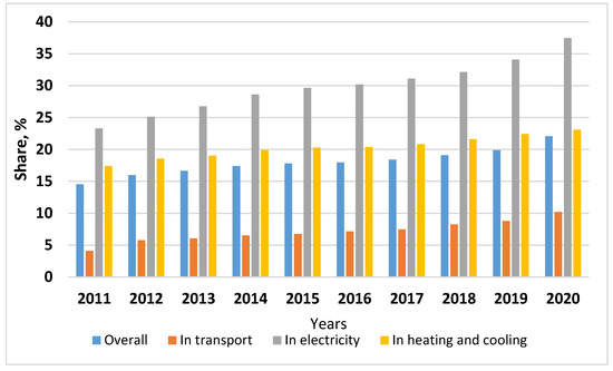 The European Union has set a strategic goal to become the first climate-neutral continent by 2050. This can be achieved by a variety of measures, including the significant development of RE. The share of renewables in the overall energy mix increased from 14.55% in 2011 to 22.09% in 2020 (therefore, the EU has achieved its target of 20%). In 2020, the countries with leading positions in RE promotion included Sweden (60.1%), Finland (43.8%), and Latvia (42.1%), whereas Belgium (13.0%), Luxembourg (11.7%), and Malta (10.7%) had the lowest share of energy from renewable sources [6]. The largest share of renewables was in electricity use, whereas the lowest one was in transport use (Figure 2) [7].