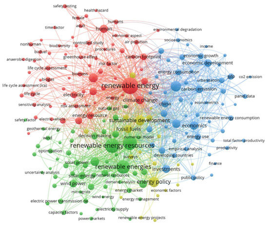 - The third (blue) cluster (56 items) includes papers about economic, social, and institutional factors affecting RE development. They include GDP, national income, economic growth, public policy quality, etc.