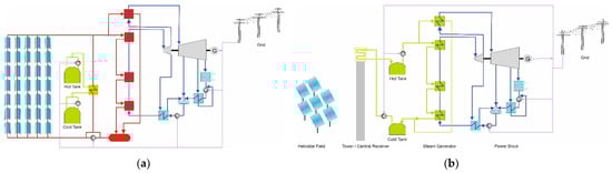 10] studied different options to combine the benefits of PV and CSP technologies. A small PV plant that supplied its own consumption of the CSP plant, hybrid CSP-PV plants with an optional electric heater, and a PV system with an additional electric heater were simulated in different scenarios. For the Spanish location, the most economic configuration combined the CSP plant, which charged the thermal storage during daytime and produced electricity during nighttime, and a PV system, which delivered electricity during day hours, additionally charging the thermal storage with an electric heater. In contrast, the calculation of the best configuration in a high direct normal irradiance (DNI) site such as South Africa resulted in a system without an electric heater. For both locations, the electricity produced with the CSP plant and thermal storage was more economic than the one that originated from the PV system with an electric heater. Mata-Torres et al. [