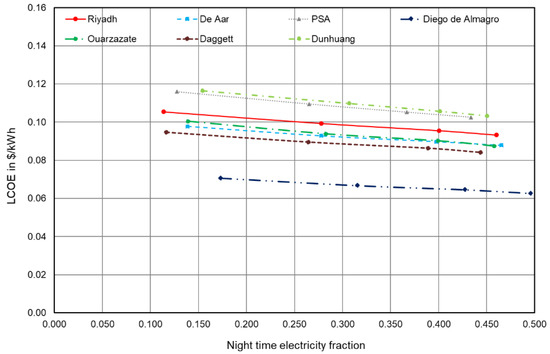 Figure 7. There is a slight cost increase as the storage capacity increases because of the higher component costs and dumping. It should also be noted that the nighttime fraction is higher for Riyadh and Diego de Almagro due to the greater proximity to the equator. Parabolic troughs suffer from low sun angles and sites close to the equator show smaller differences in the sun angles between summer and winter. Furthermore, the day length is also rather constant compared to sites with higher latitudes. This is an advantage as storage charging and discharging is more equally balanced over the year. More pronounced seasons with variable day lengths are not ideal, leading to storage and ERH over dimensioning for winter days. Moreover, there is an additional clear correlation of the nighttime electricity fraction and the solar resource. The plant with 12 h of thermal storage at Dunhuang only shows a nighttime fraction of 0.33 while the plant with the same storage size at Diego the Almagro shows a nighttime fraction of 0.43. For all sites, LCOE is below 8 cents per kWh. Due to the larger PV field, GHI increases its influence compared to the DNI. PSA clearly shows lower LCOE values than Dunhuang because of the higher GHI. Riyadh, the site with the second highest GHI, also displays a clear improvement, with this technology showing lower LCOE than Ouarzazate and De Aar for large storage capacities.