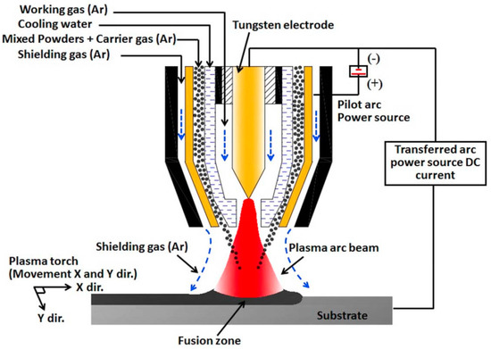 Plasma cladding is an effective way to manufacture the coatings with large area, with advantages such as low thermal distortion, very high energy density, as well as small dilution of the substrate material [40,41]. Plasma cladding assures good metallurgical bonding between coating and substrate, it also has a low cost in equipment and operation [42,43]. The powder of a material to be clad melts rapidly under the plasma torch, and then solidifies. The whole process takes place with a high temperature gradient. As a result, the fine-grained and tough coating forms on the substrate. The coaxial and preplaced powder schemes are the two most popular plasma cladding systems. In the first scheme, the surface of the substrate is irradiated by the plasma torch forming the liquid melt pool (see Figure 1). The carrier (or working) gas ejects the powder under pressure from the nozzle. The powder then melts in the plasma torch, forming a cladding layer. The working gas (usually argon) feeds the powder from this nozzle into the melted pool. Argon also acts as a shielding gas to avoid oxidization. Thus, the powder feeding nozzle moves simultaneously with the plasma torch. They scan the substrate “line-by-line”. In the case of preplaced powder systems, the substrate is covered by the powder mixture as cladding material before melting. Frequently, glue is used to fix the pre-placed mixed powders to the surface and form the few mm thick powder bed. Before cladding, the samples are usually preheated at ~100 °C for few hours to remove the glue. Then, the plasma torch scans the preplaced powder mixture. As a result, the powder mixture melts and, afterwards, rapidly cools down. The cladding layer is formed in such a way.
